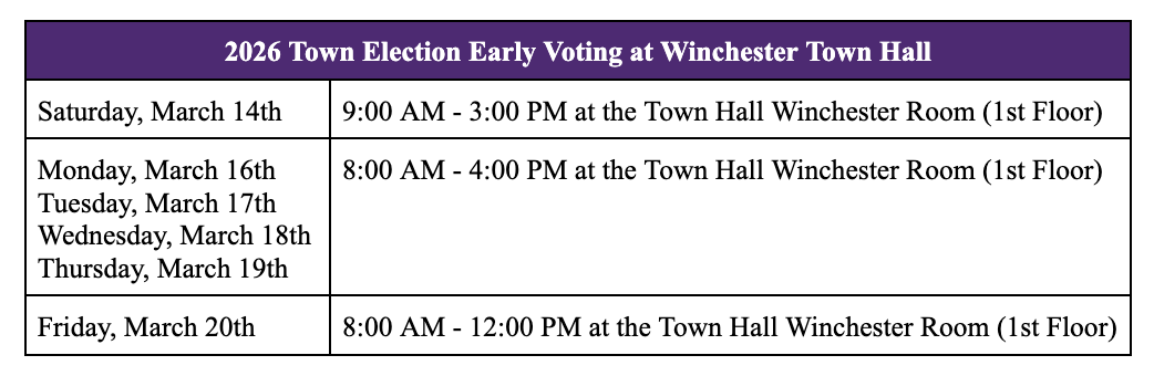 In order to vote in the 2026 Town Election, you must be registered to vote in Winchester before March 11th. You can register to vote and check your registration status on the Massachusetts Secretary of State website.